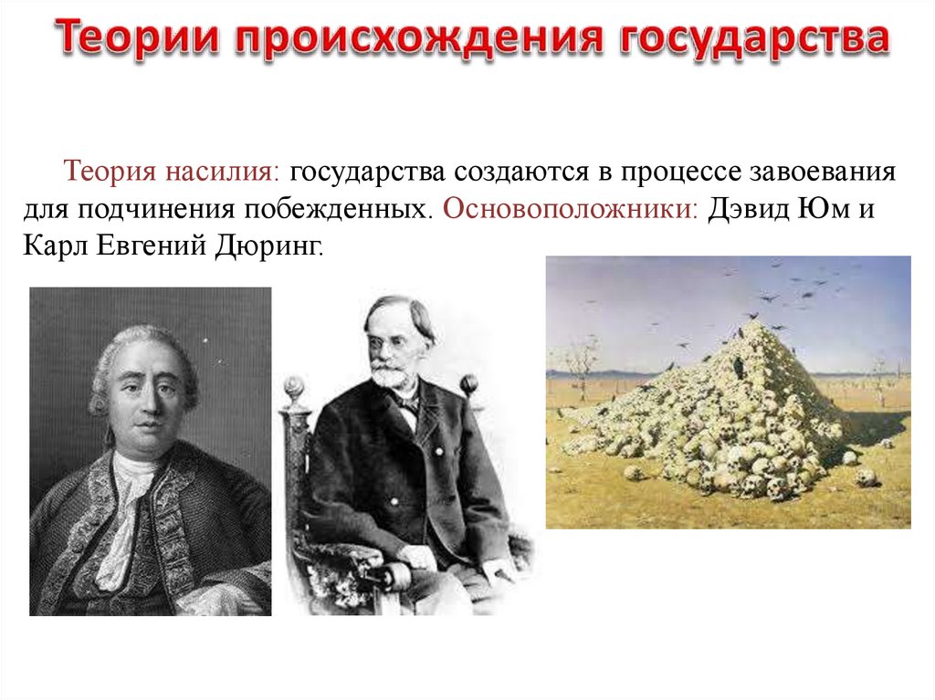 Теория насилия: государства создаются в процессе завоеваниядля подчинения побежденных. Основоположники: Дэвид Юм и