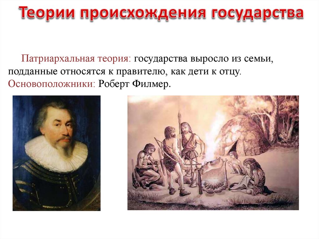 Патриархальная теория: государства выросло из семьи,подданные относятся к правителю, как дети к отцу.