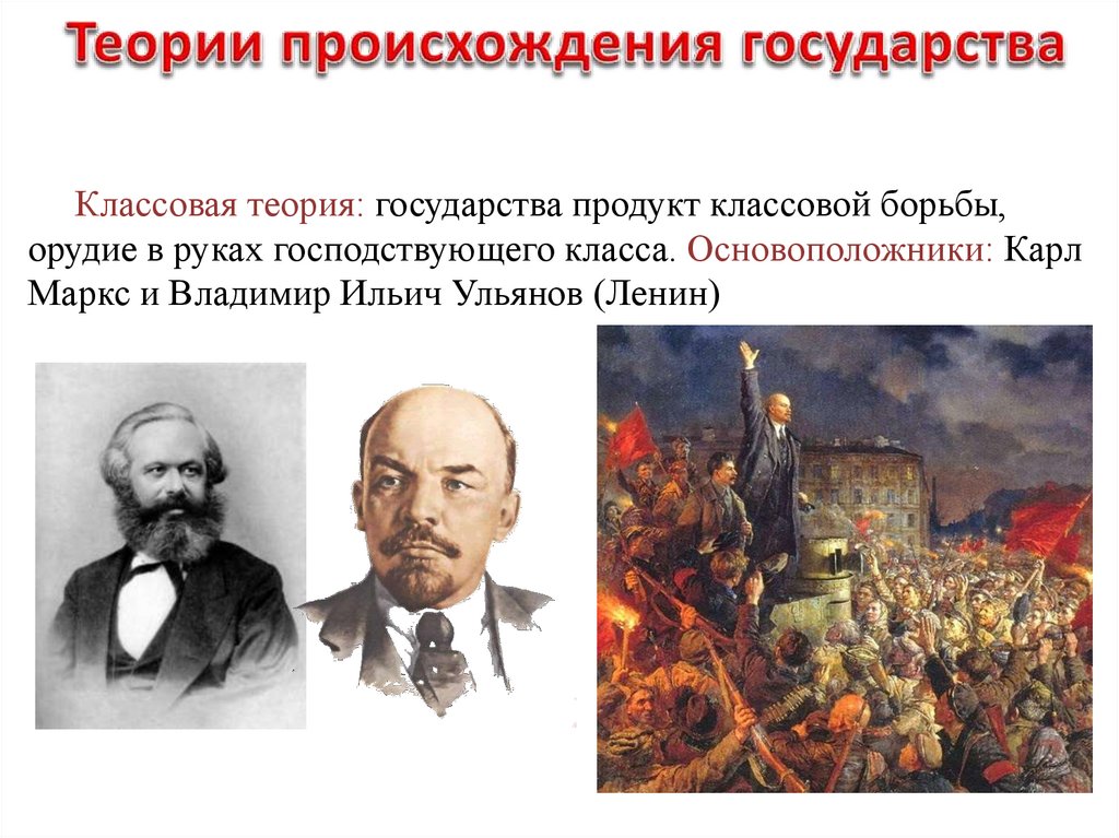 Классовая теория: государства продукт классовой борьбы,орудие в руках господствующего класса. Основоположники: Карл