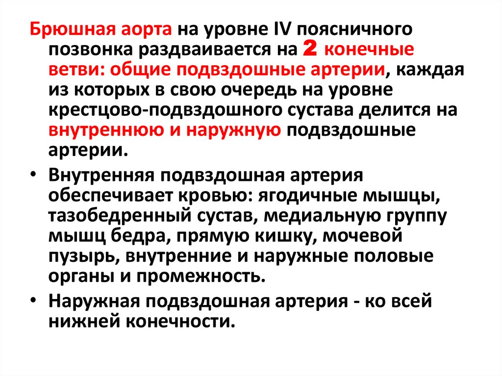Брюшная аорта на уровне IV поясничногопозвонка раздваивается на 2 конечные