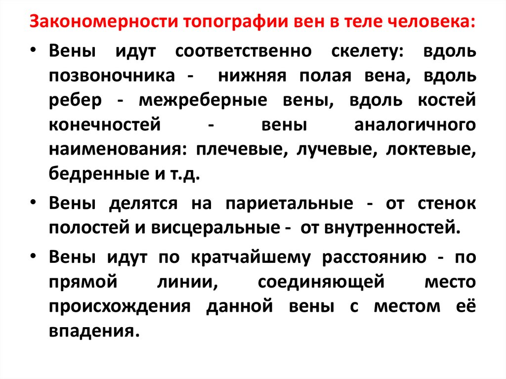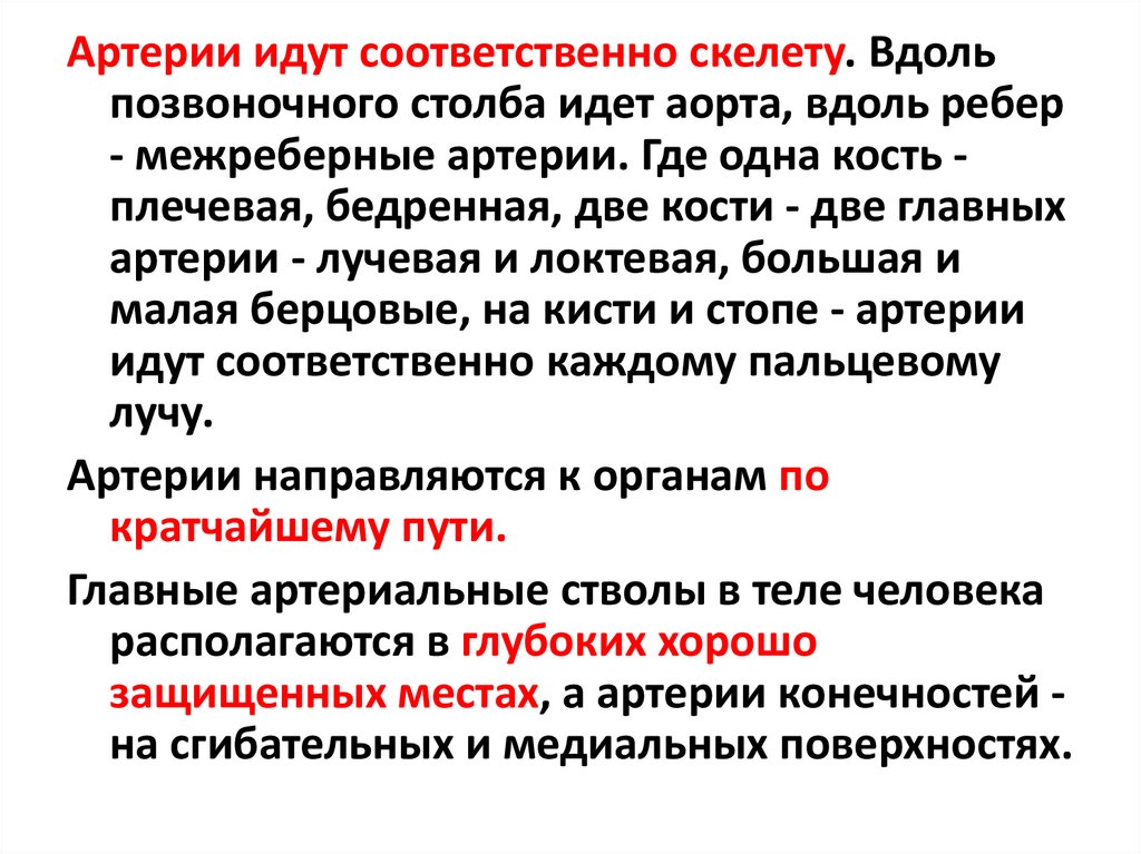 Артерии идут соответственно скелету. Вдольпозвоночного столба идет аорта, вдоль ребер