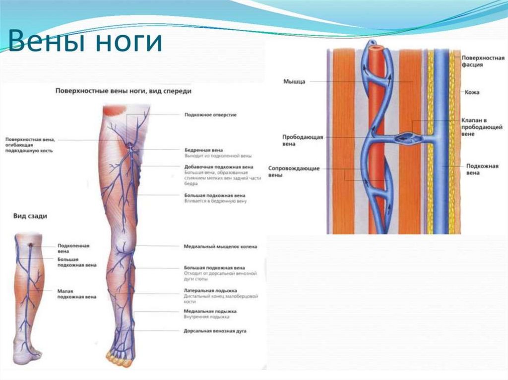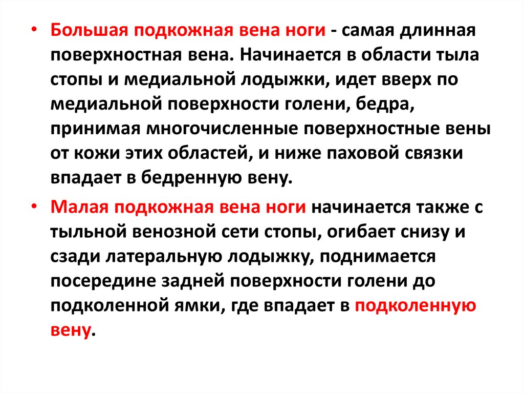 • Большая подкожная вена ноги - самая длиннаяповерхностная вена. Начинается в области тыла