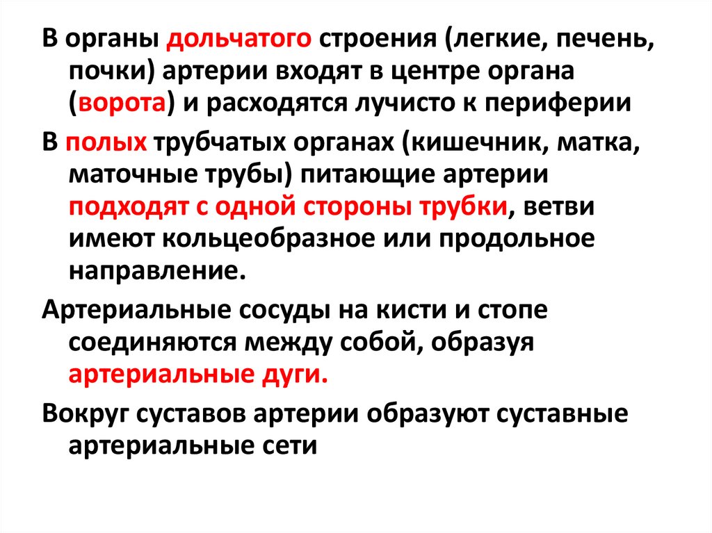 В органы дольчатого строения (легкие, печень,почки) артерии входят в центре органа