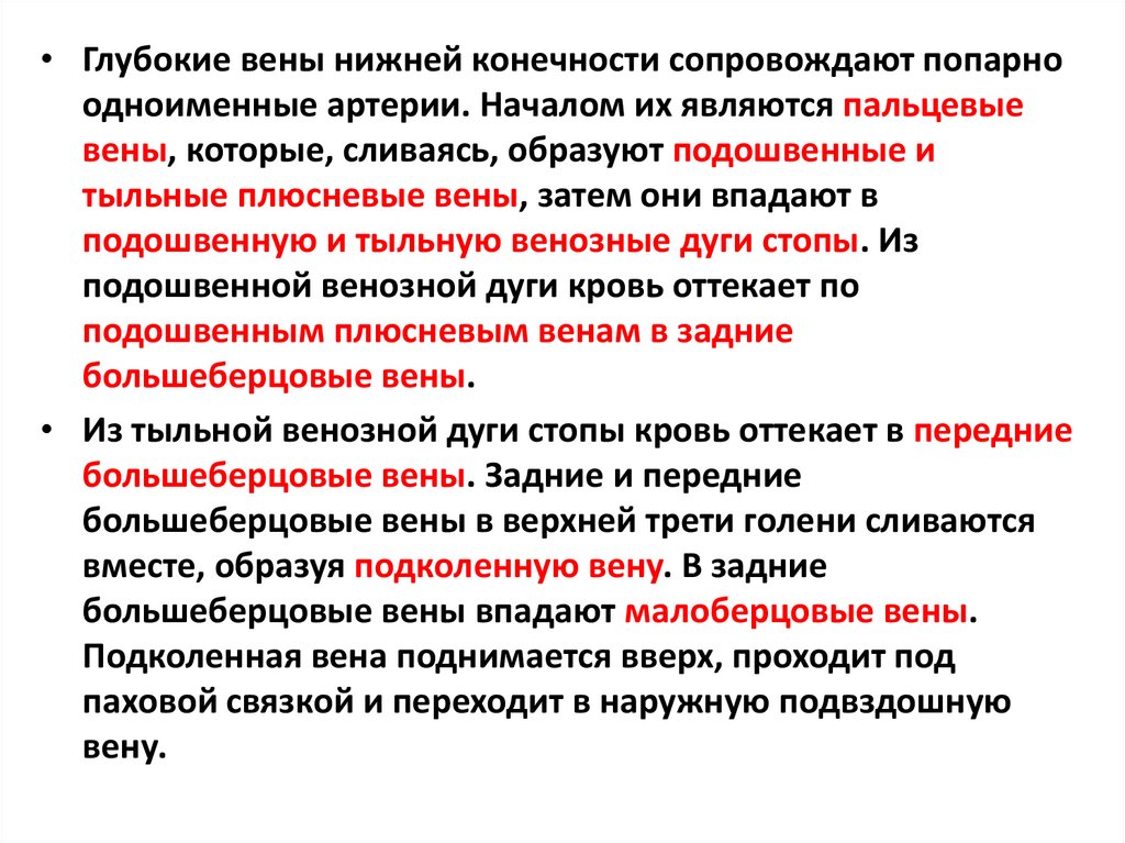• Глубокие вены нижней конечности сопровождают попарноодноименные артерии. Началом их являются пальцевые
