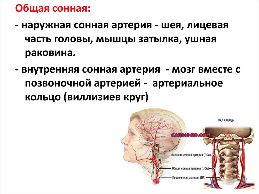 Общая сонная:- наружная сонная артерия - шея, лицевая