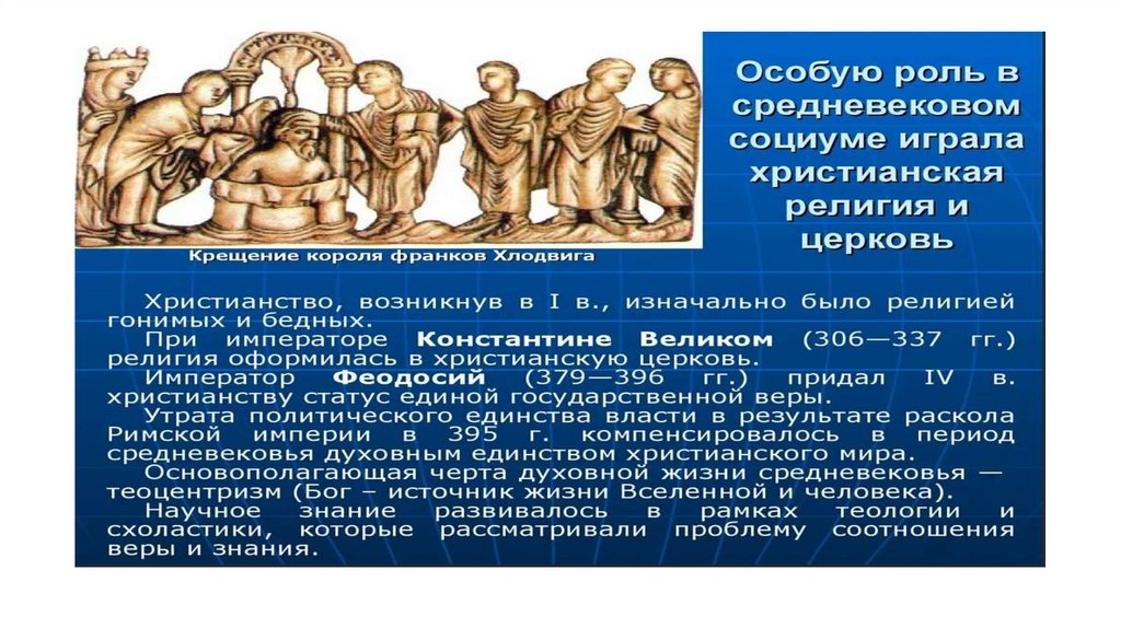 • Теологическому мировоззрению были подчинены мораль, философия, наука, искусство. Религия