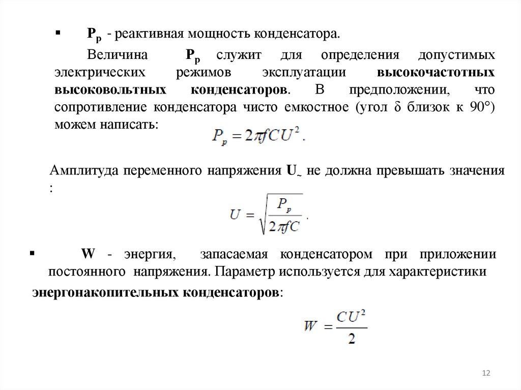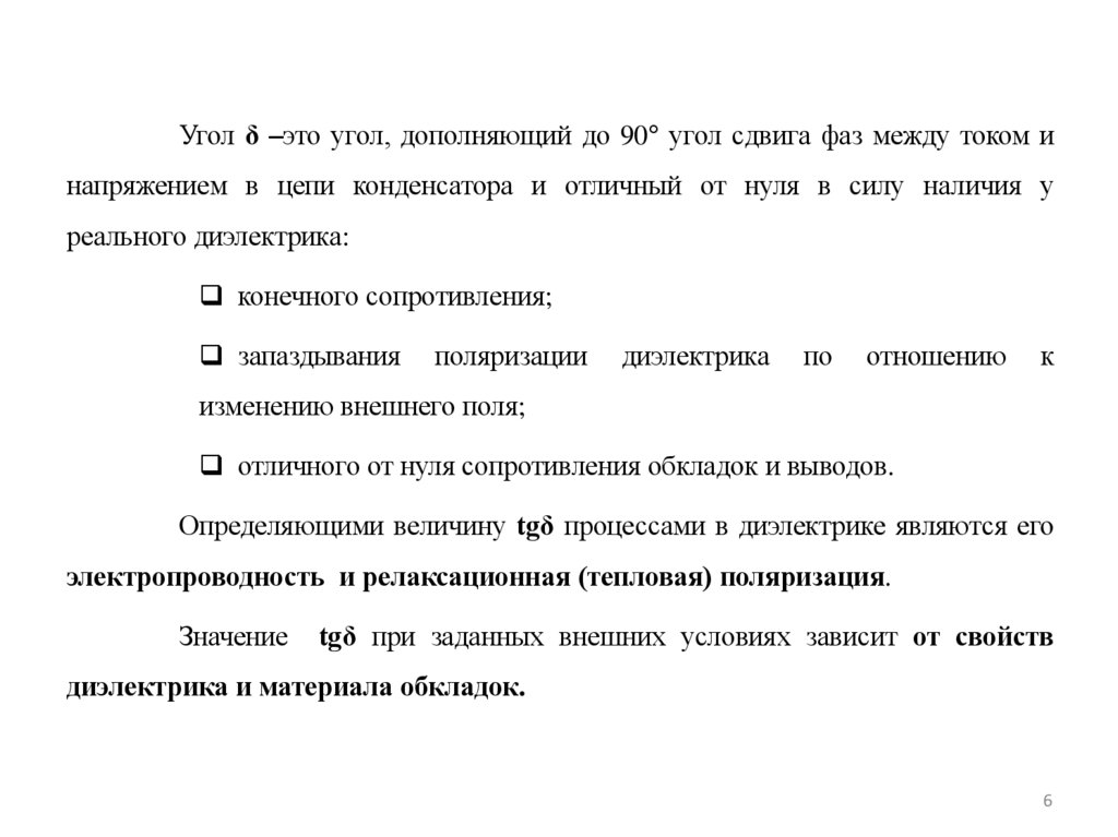 Угол δ –это угол, дополняющий до 90° угол сдвига фаз между током инапряжением в цепи конденсатора и отличный от нуля в силу наличия у