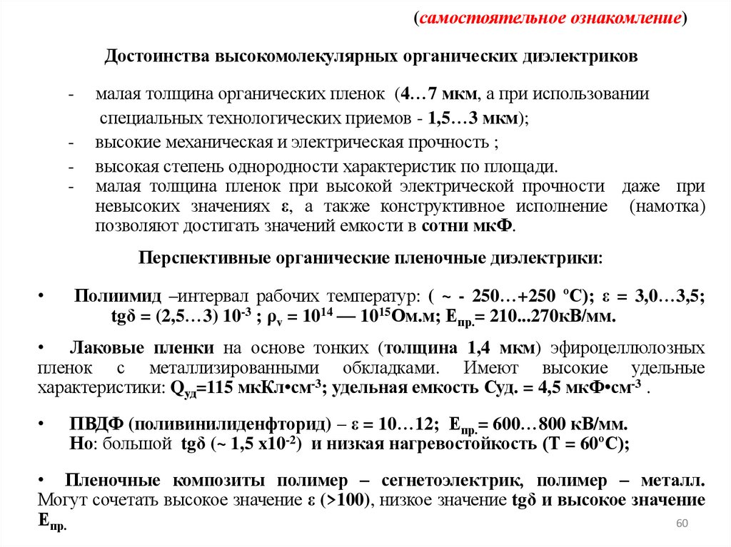 (самостоятельное ознакомление)Достоинства высокомолекулярных органических диэлектриков