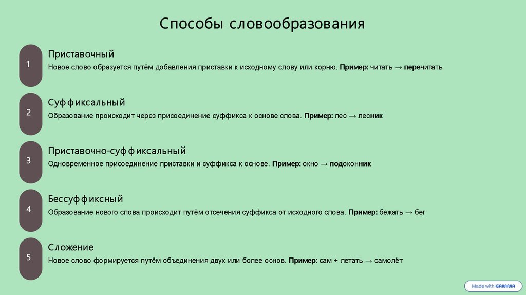 Новое слово формируется путём объединения двух или более основ. Пример: сам + летать → самолёт