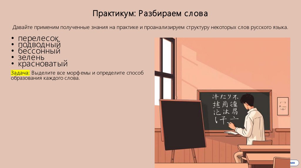 Практикум: Разбираем словаДавайте применим полученные знания на практике и проанализируем структуру некоторых слов русского языка.