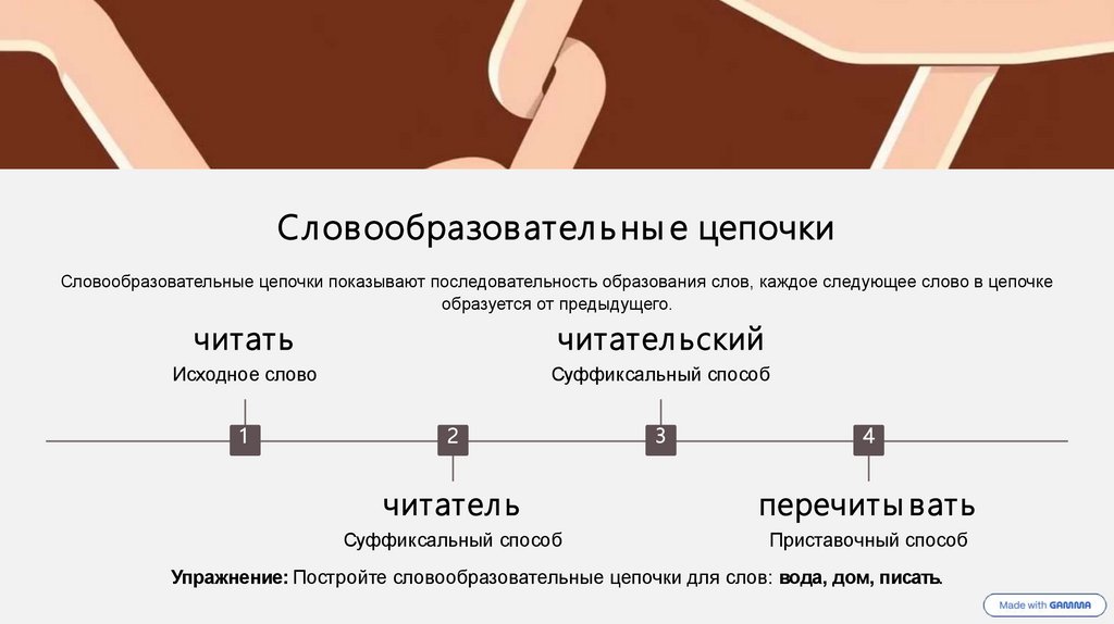 Словообразовател ь ны е цепочкиСловообразовательные цепочки показывают последовательность образования слов, каждое следующее слово в цепочке