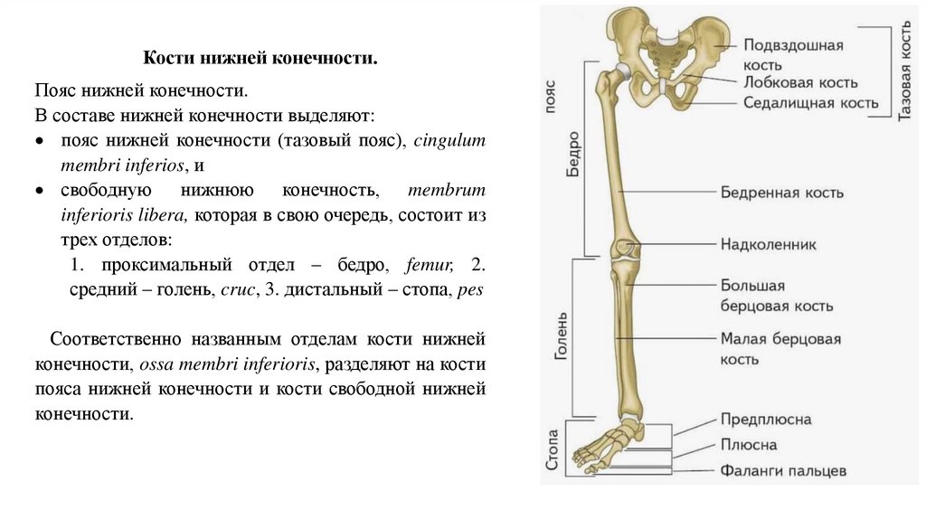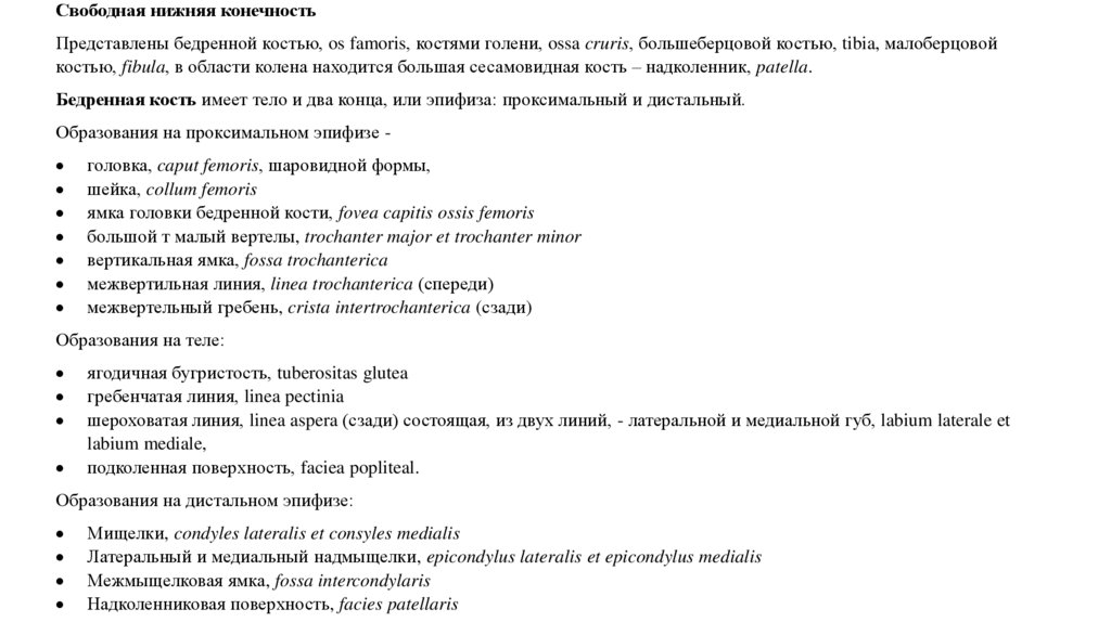 Свободная нижняя конечностьПредставлены бедренной костью, os famoris, костями голени, ossa cruris, большеберцовой костью, tibia, малобeрцовой