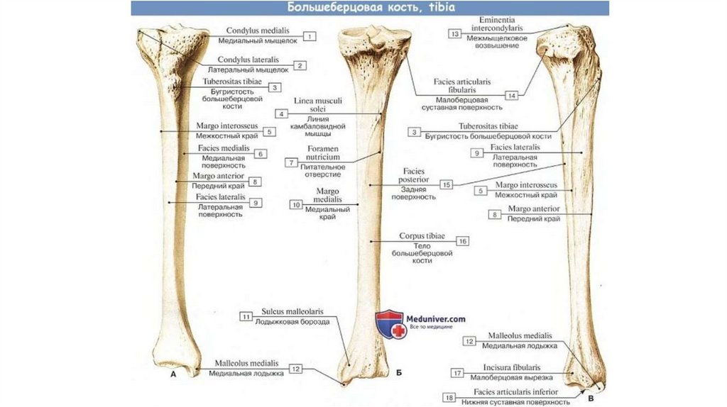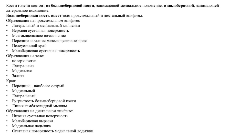 Кости голени состоит из большеберцовой кости, занимающей медиальное положение, и малоберцовой, занимающейлатеральное положение.
