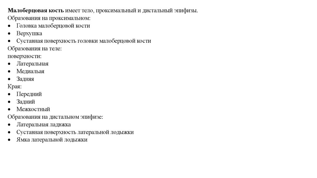 Малоберцовая кость имеет тело, проксимальный и дистальный эпифизы.Образования на проксимальном: