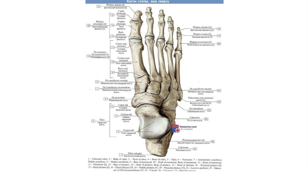 Кости предплюсны включает 7 костей, принято выделять 2 ряда: