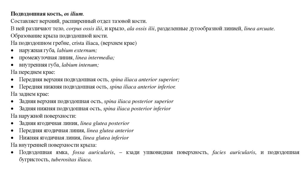 В ней различают тело, corpus ossis ilii, и крыло, ala ossis ilii, разделенные дугообразной линией, linea arcuate.