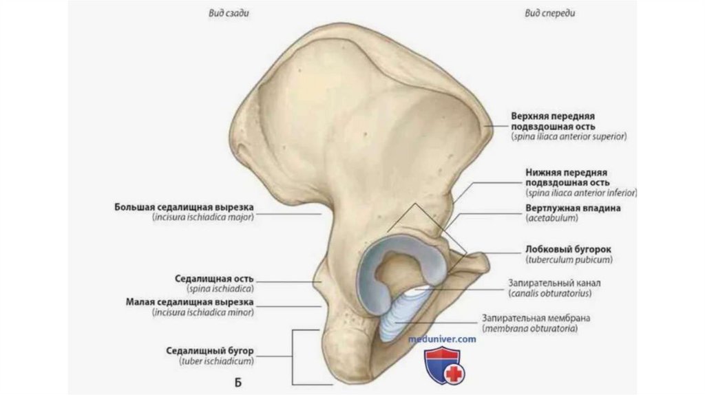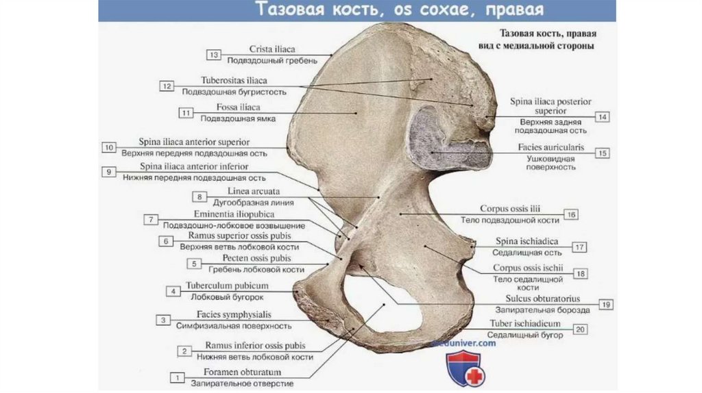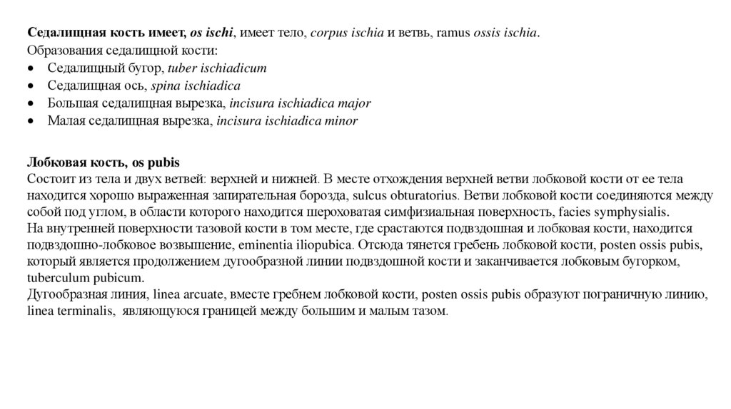 Седалищная кость имеет, os ischi, имеет тело, corpus ischia и ветвь, ramus ossis ischia.Образования седалищной кости: