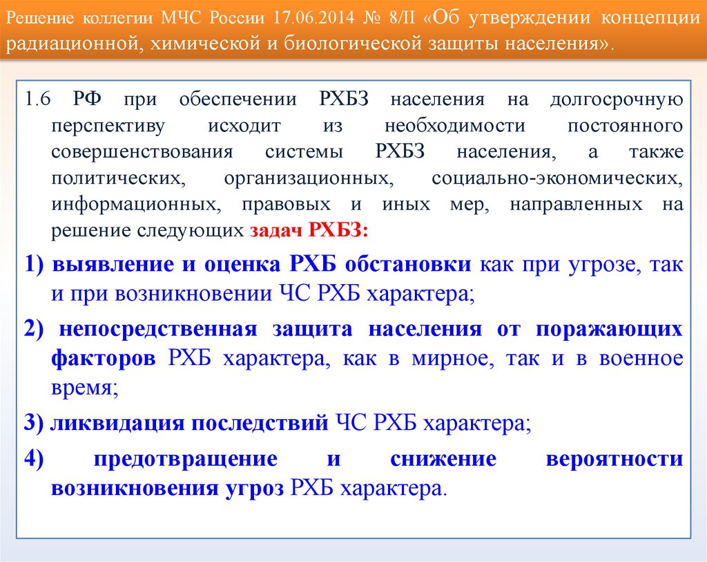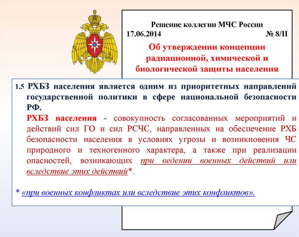 Решение коллегии МЧС России 17.06.2014 № 8/II «Об утверждении концепциирадиационной, химической и биологической защиты населения».