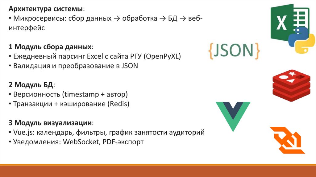 Архитектура системы:• Микросервисы: сбор данных → обработка → БД → вебинтерфейс