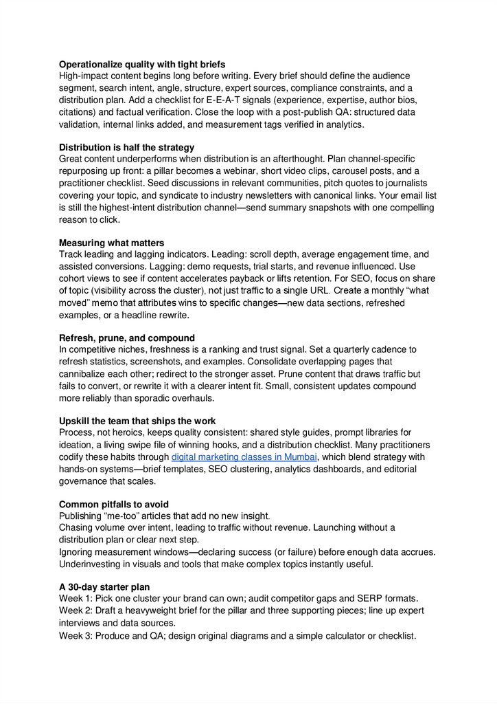 Week 1: Pick one cluster your brand can own; audit competitor gaps and SERP formats.