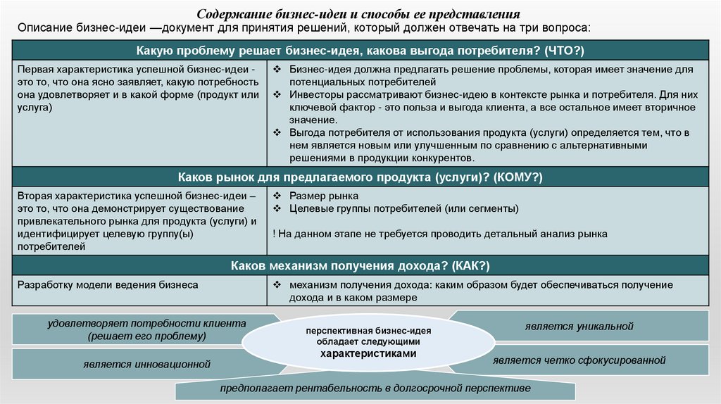 Содержание бизнес-идеи и способы ее представленияОписание бизнес-идеи —документ для принятия решений, который должен отвечать на три вопроса: