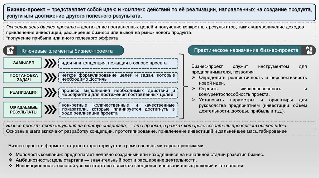 Бизнес-проект – представляет собой идею и комплекс действий по её реализации, направленных на создание продукта,услуги или достижение другого полезного результата.