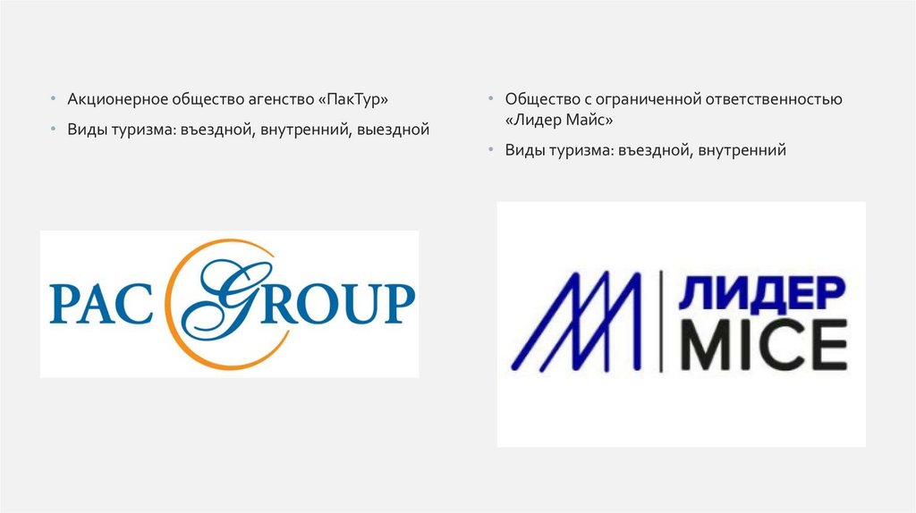 • Акционерное общество агенство «ПакТур»• Виды туризма: въездной, внутренний, выездной