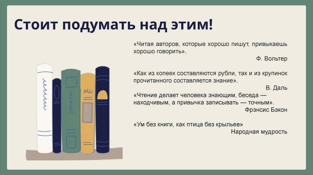 Стоит подумать над этим!«Читая авторов, которые хорошо пишут, привыкаешь