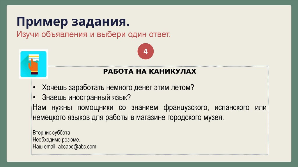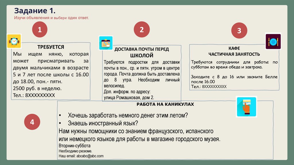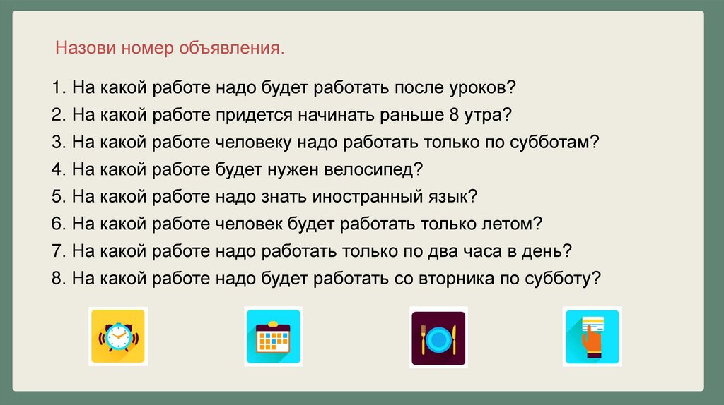 Назови номер объявления.1. На какой работе надо будет работать после уроков?