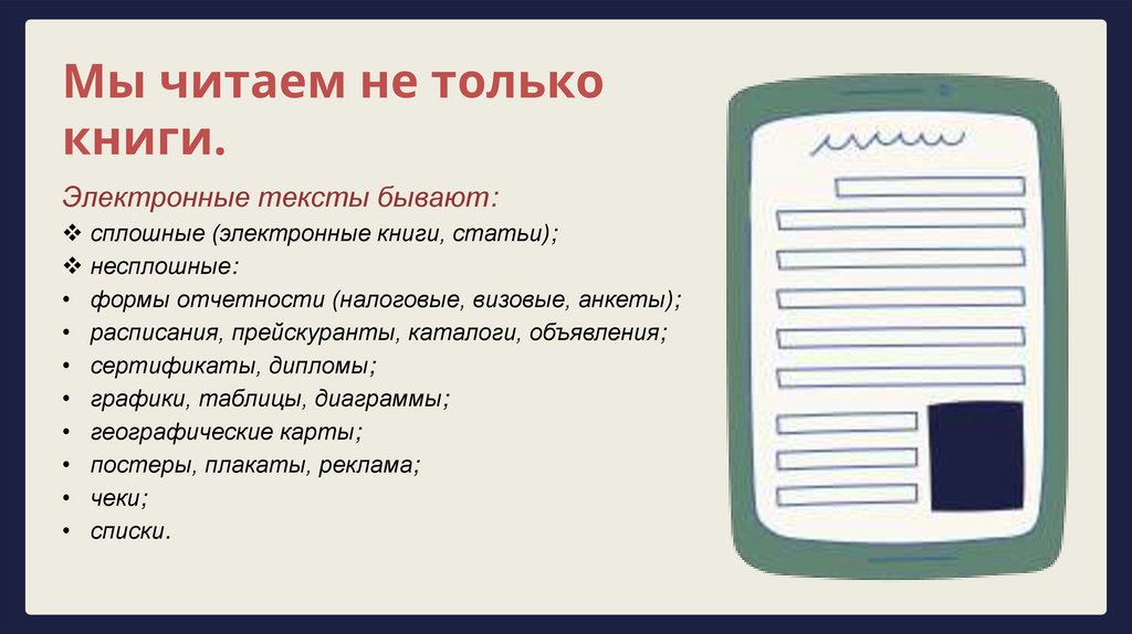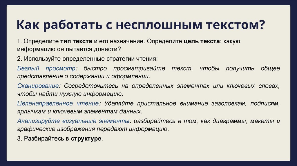 Как работать с несплошным текстом?1. Определите тип текста и его назначение. Определите цель текста: какую