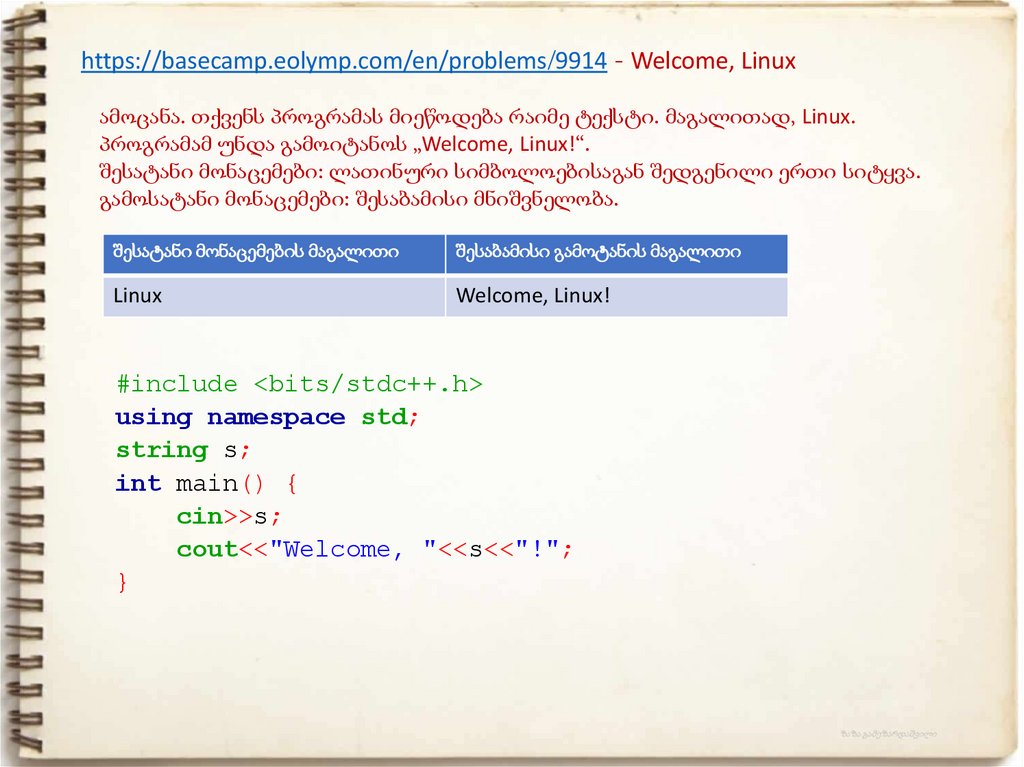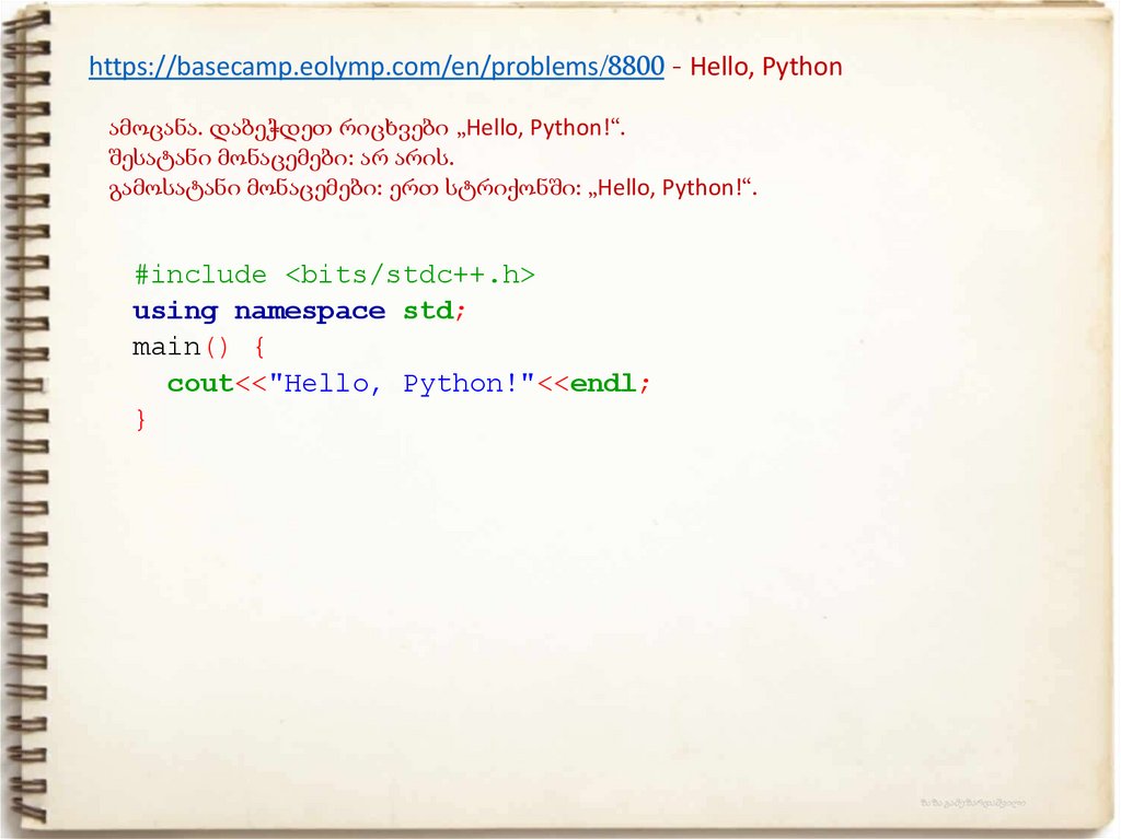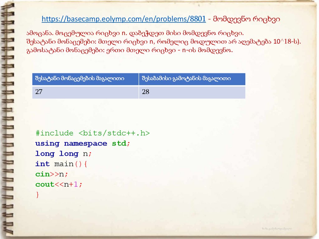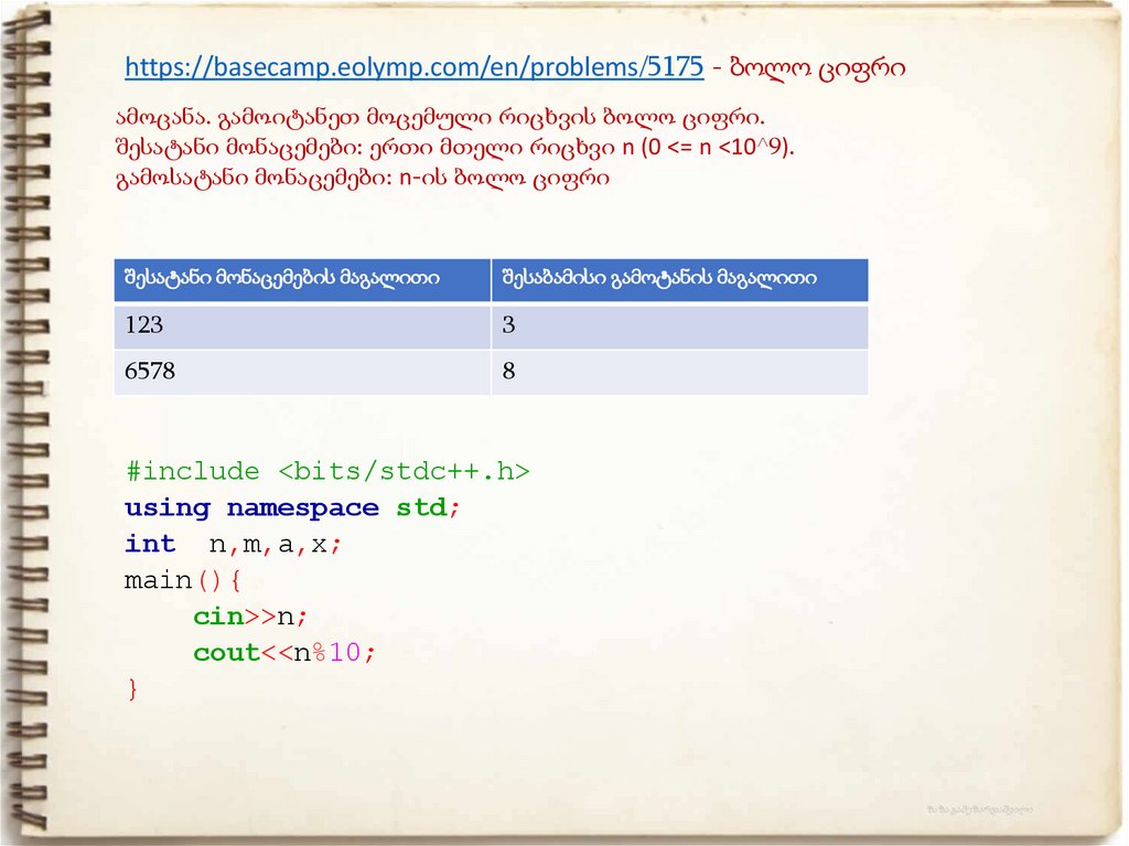 https://basecamp.eolymp.com/en/problems/5175 - ბოლო ციფრიამოცანა. გამოიტანეთ მოცემული რიცხვის ბოლო ციფრი.