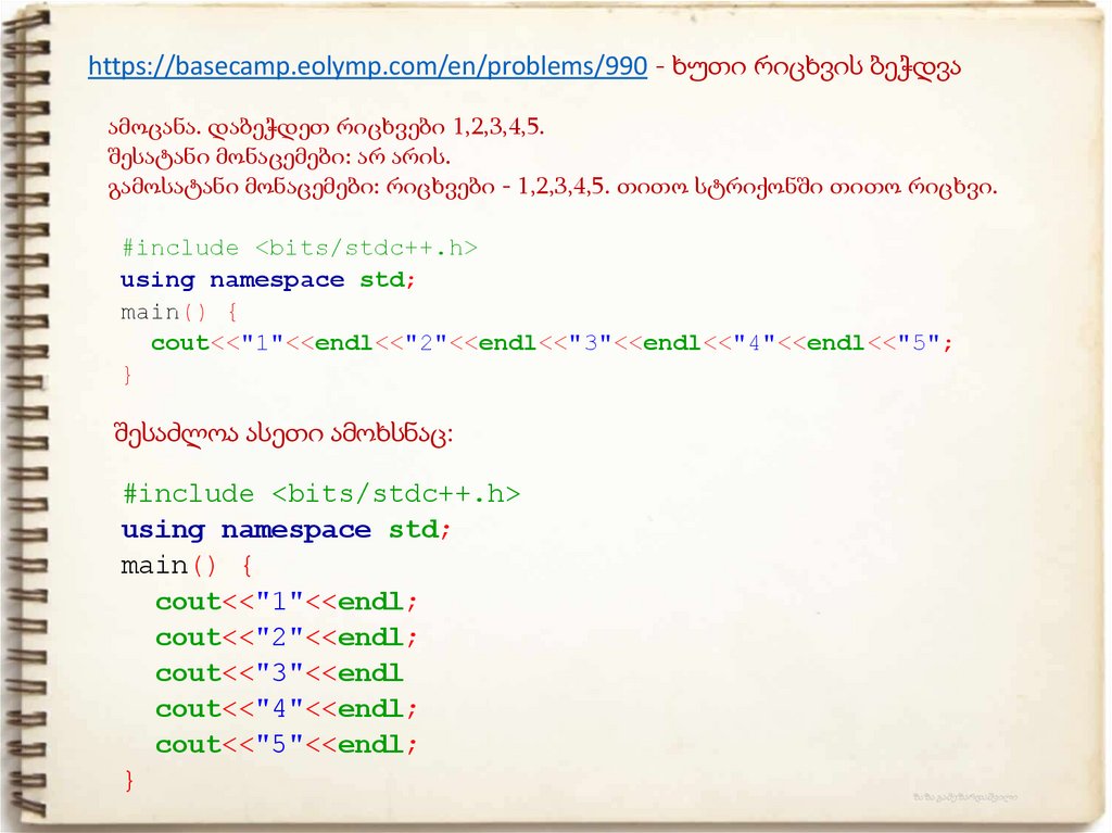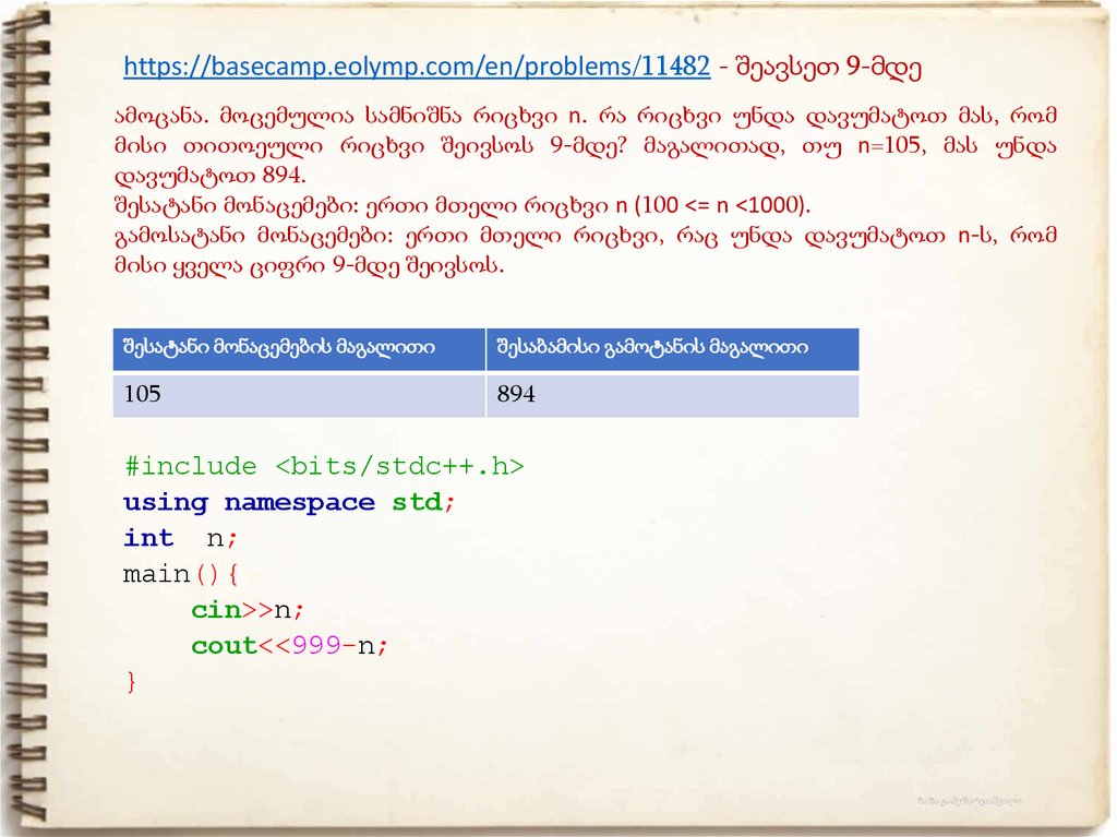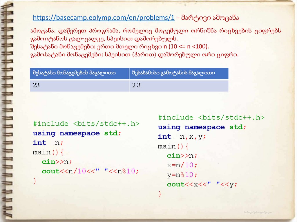 https://basecamp.eolymp.com/en/problems/1 - მარტივი ამოცანაამოცანა. დაწერეთ პროგრამა, რომელიც მოცემული ორნიშნა რიცხვების ციფრებს