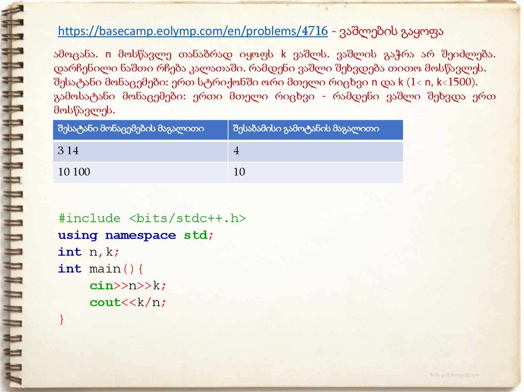 https://basecamp.eolymp.com/en/problems/4716 - ვაშლების გაყოფაამოცანა. n მოსწავლე თანაბრად იყოფს k ვაშლს. ვაშლის გაჭრა არ შეიძლება.