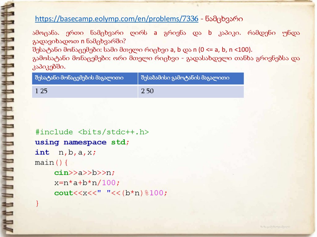 https://basecamp.eolymp.com/en/problems/7336 - ნამცხვარიამოცანა. ერთი ნამცხვარი ღირს a გრივნა და b კაპიკი. რამდენი უნდა