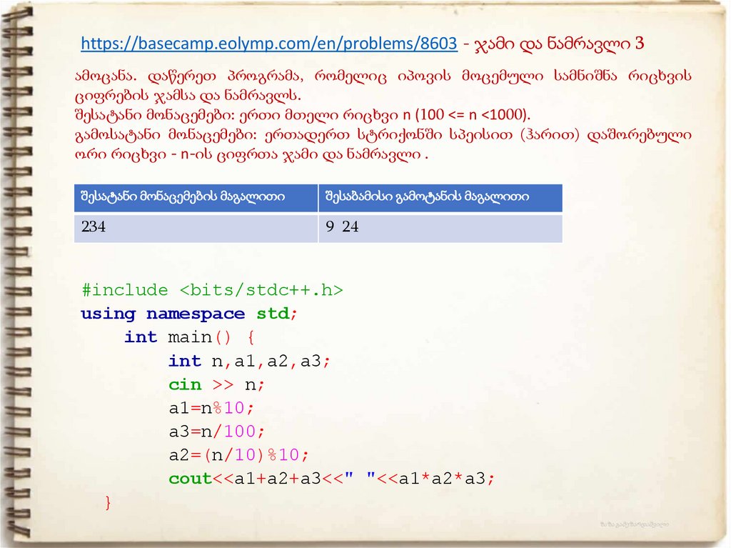 https://basecamp.eolymp.com/en/problems/8603 - ჯამი და ნამრავლი 3ამოცანა. დაწერეთ პროგრამა, რომელიც იპოვის მოცემული სამნიშნა რიცხვის