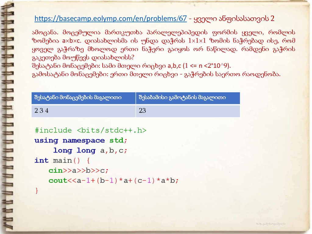 https://basecamp.eolymp.com/en/problems/67 - ყველი ანფისასათვის 2ამოცანა. მოცემულია მართკუთხა პარალელეპიპედის ფორმის ყველი, რომლის