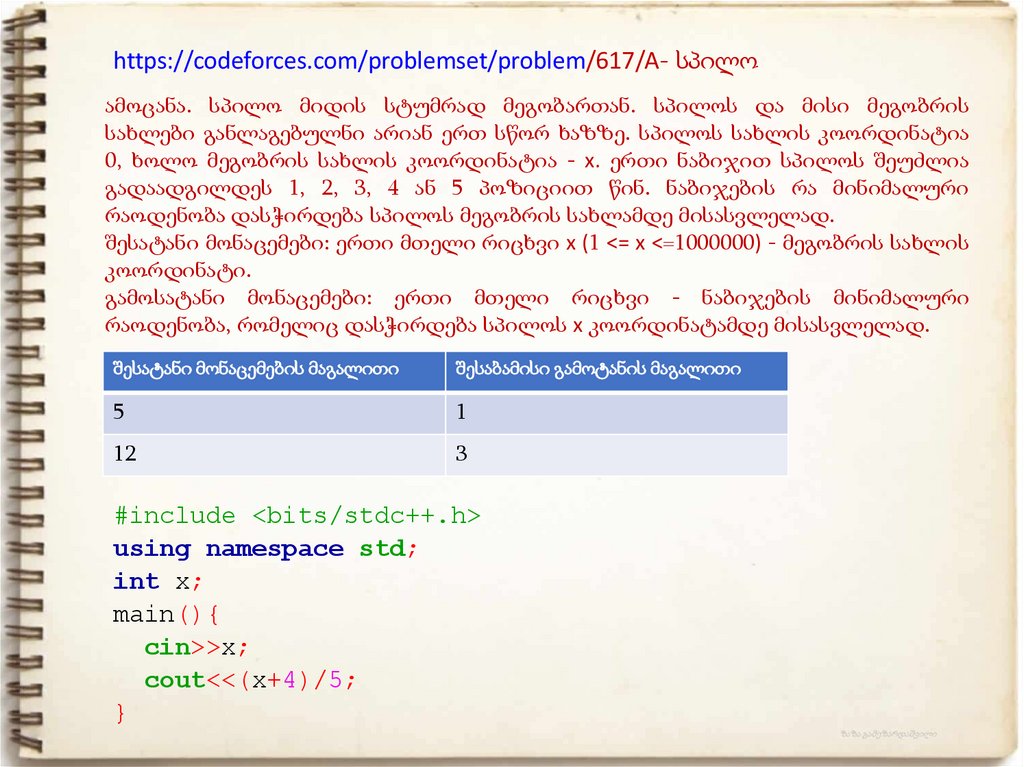 https://codeforces.com/problemset/problem/617/A- სპილოამოცანა. სპილო მიდის სტუმრად მეგობართან. სპილოს და მისი მეგობრის