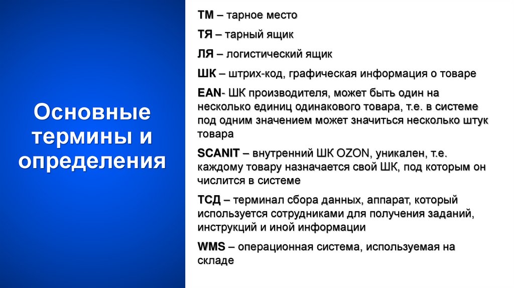 ТМ – тарное местоТЯ – тарный ящик