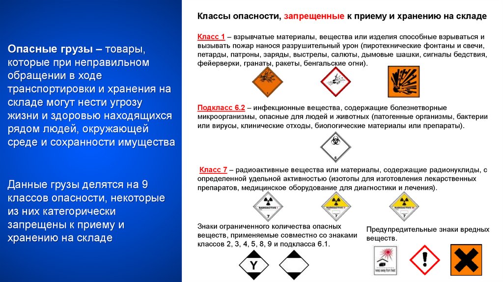 Классы опасности, запрещенные к приему и хранению на складеОпасные грузы – товары,
