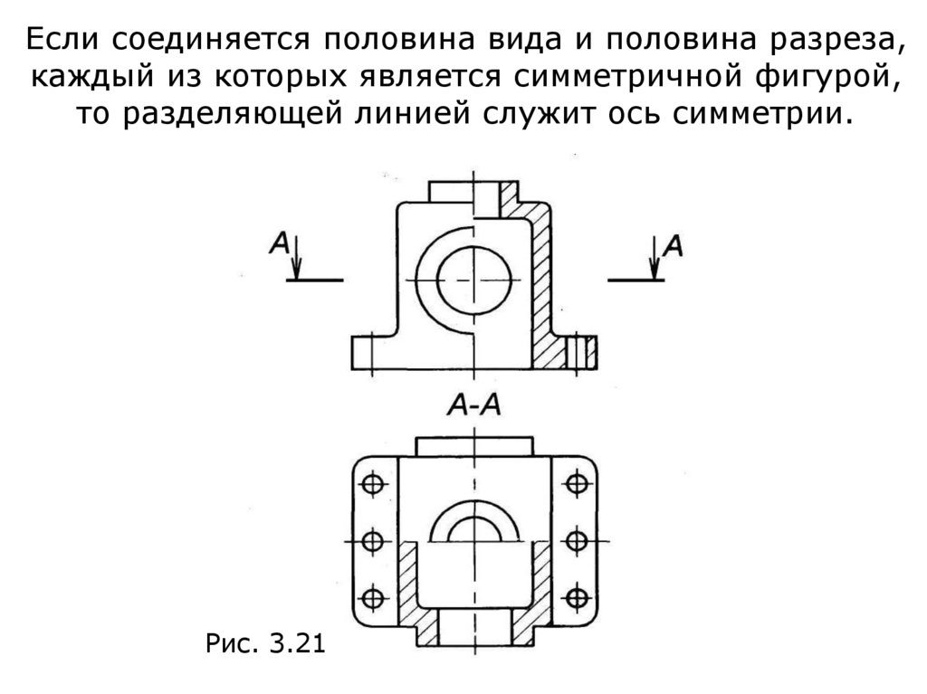 Если соединяется половина вида и половина разреза,каждый из которых является симметричной фигурой,