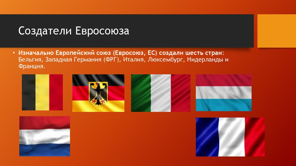 Создатели Евросоюза• Изначально Европейский союз (Евросоюз, ЕС) создали шесть стран: