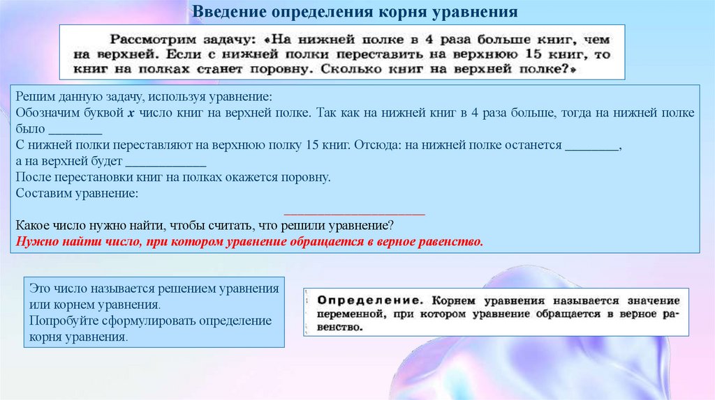 Введение определения корня уравненияРешим данную задачу, используя уравнение: