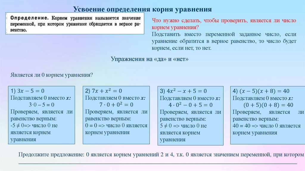 Усвоение определения корня уравненияЧто нужно сделать, чтобы проверить, является ли число