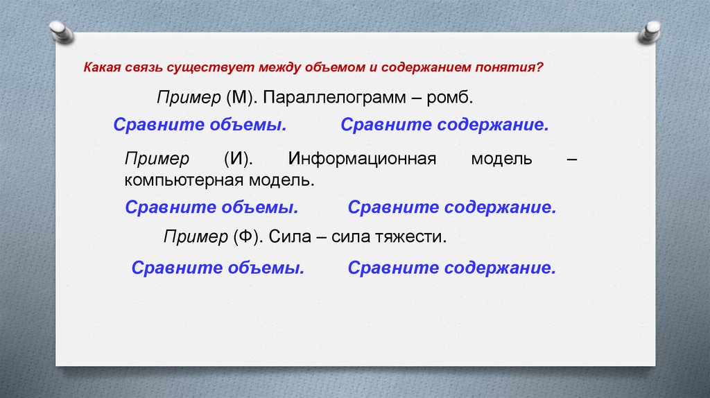 Какая связь существует между объемом и содержанием понятия?Пример (М). Параллелограмм – ромб.