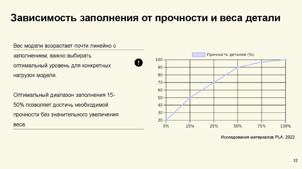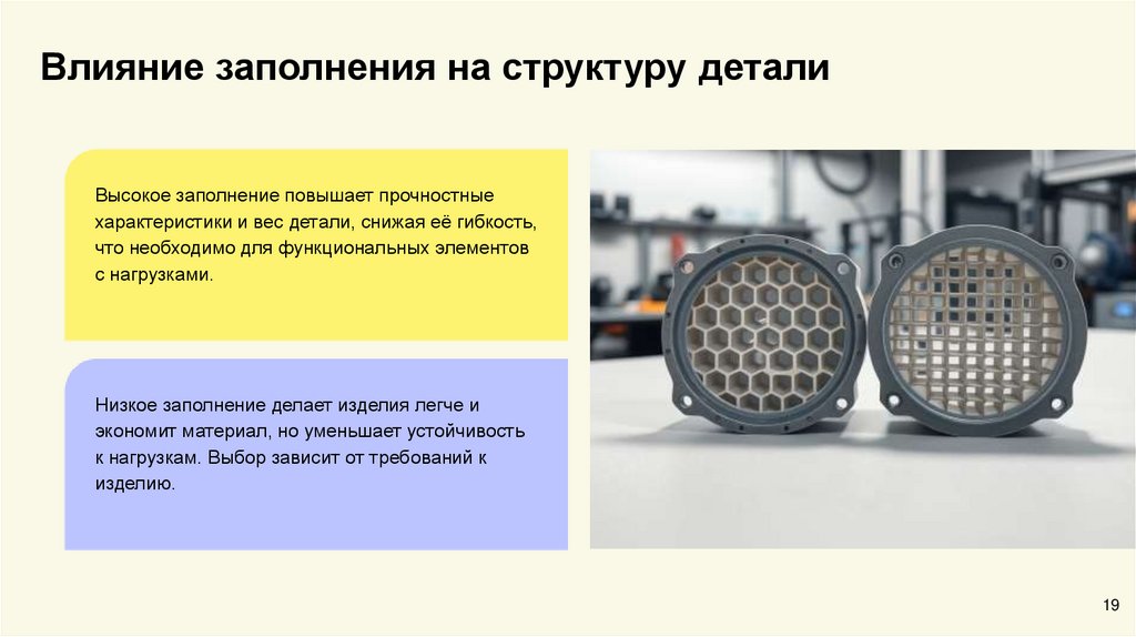Влияние заполнения на структуру деталиВысокое заполнение повышает прочностные