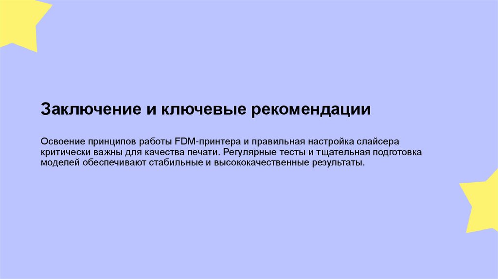 Заключение и ключевые рекомендацииОсвоение принципов работы FDM-принтера и правильная настройка слайсера