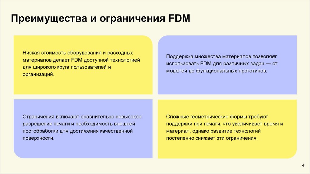 Преимущества и ограничения FDMНизкая стоимость оборудования и расходных