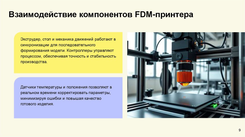 Взаимодействие компонентов FDM-принтераЭкструдер, стол и механика движений работают в