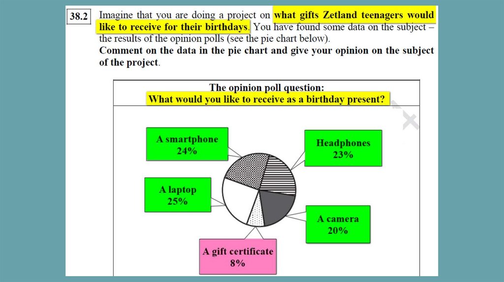 1) The aim of my project is to find out what gifts Zetlandteenagers would like to receive for their birthdays. As part of