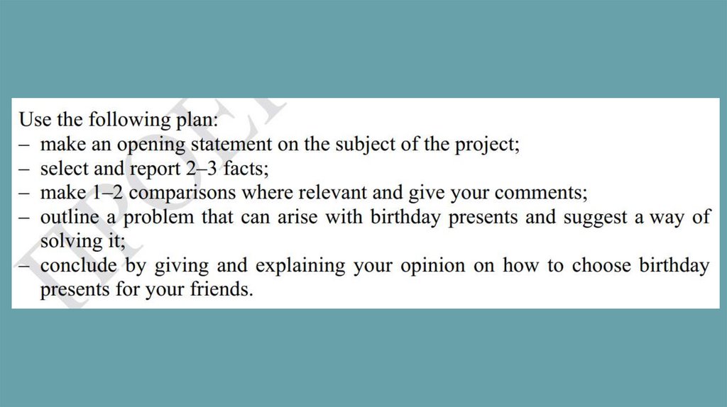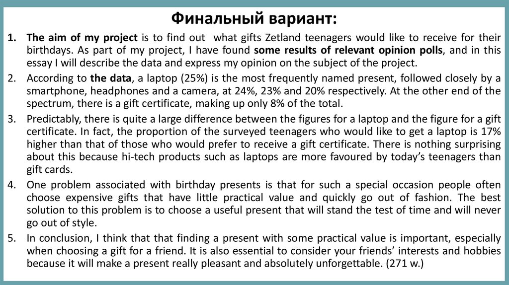 Финальный вариант:1. The aim of my project is to find out what gifts Zetland teenagers would like to receive for their